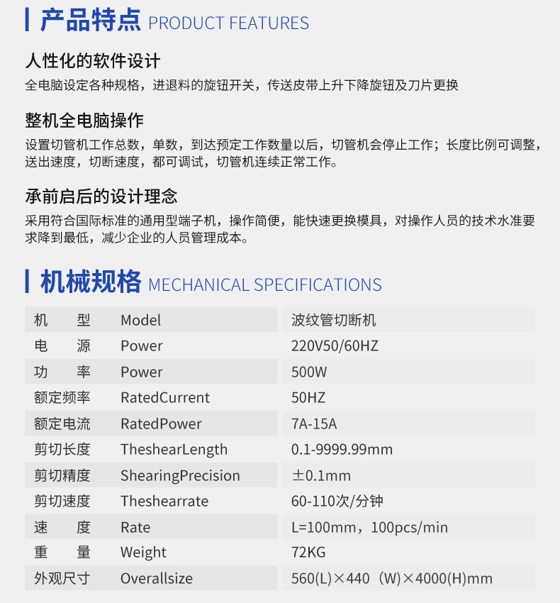 LL-150全數(shù)字智能波紋管切斷機(jī) 產(chǎn)品說(shuō)明: 本機(jī)專門為汽車線束行業(yè)的波紋管開(kāi)發(fā)設(shè)計(jì),高精度PLC控制,操作簡(jiǎn)單易懂,全自動(dòng)電腦切管機(jī),可用于圓形塑料軟管,波紋管的裁切,加工效率,穩(wěn)定可靠,采用步進(jìn)電機(jī)送料,具有送料...