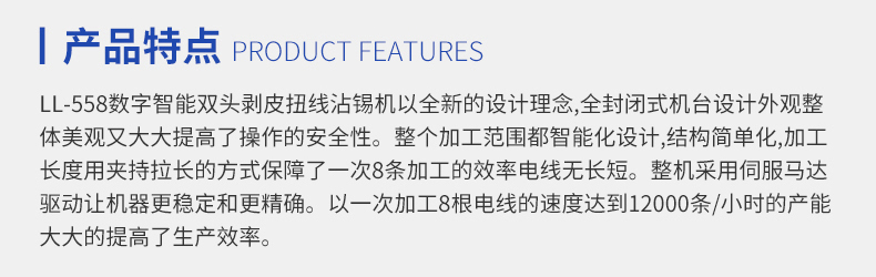 LL-558全數(shù)字智能雙頭剝皮扭線沾錫機(jī) 產(chǎn)品說(shuō)明: LL-558數(shù)字智能雙頭剝皮扭線沾錫機(jī)以全新的設(shè)計(jì)理念,全封閉式機(jī)臺(tái)設(shè)計(jì)外觀整體美觀又大大提高了操作的安全性。整個(gè)加工范圍都智能化設(shè)計(jì),結(jié)構(gòu)簡(jiǎn)單化,加工長(zhǎng)度用夾持拉長(zhǎng)的方式...