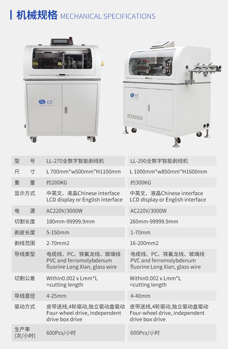 LL-270全數字智能剝線機   產品說明:   LL-270剝線機主要針對大平方電纜線切斷,剝皮難而開發,該機器采用皮帶伺服送線保證不傷線及確保線長得精準度;其中刀座還采用了蝸輪增壓式可輕松裁切橫截面達到70平方毫米和最大外徑25毫...